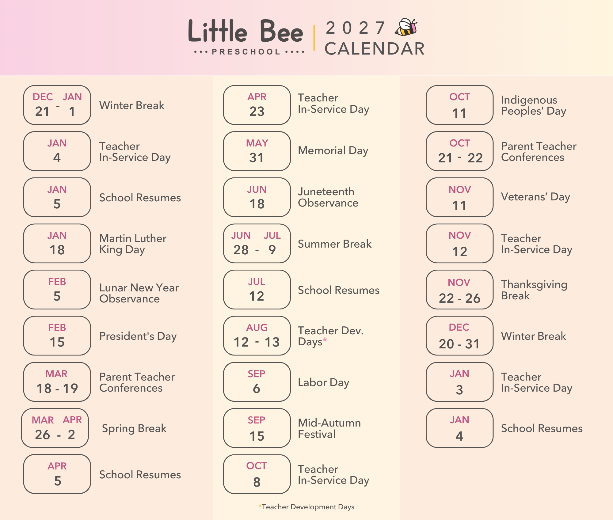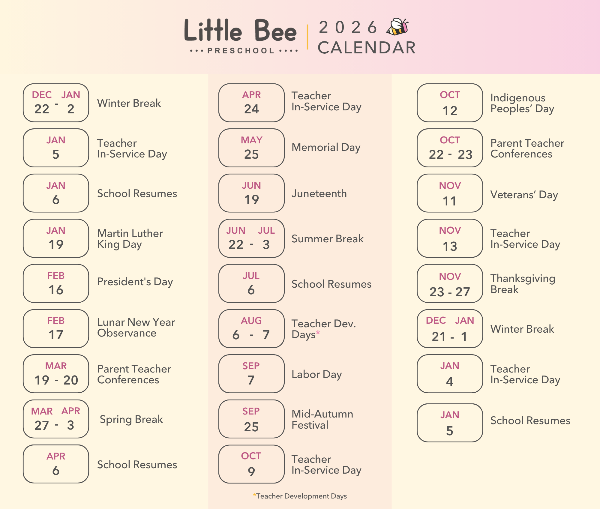 Parent-Teacher Conferences – Scheduled twice a year to discuss your child’s progress.